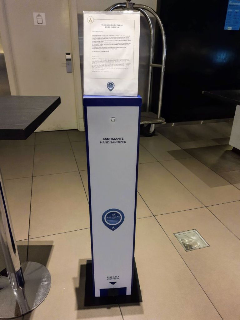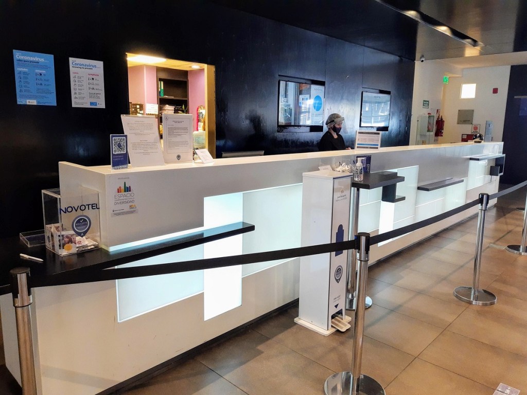 Al llegar al hotel, los protocolos son los mismos que para alojarse. Hay alcohol en gel, se toma la temperatura, se completa una ficha con una lapicera limpia que luego se separa para ser desinfectada. Al hacer check out se deja la tarjeta de la habitación en una urna.