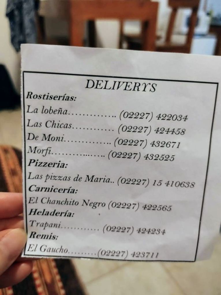 Al quedarnos una noche, no quisimos cocinar, pero como tampoco queríamos salir, pedimos delivery. Y me pareció muy cómodo que dejen un listado de opciones en la cabaña.