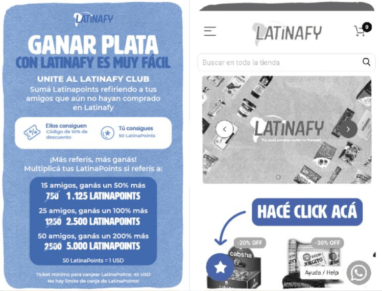 Una vez que están registrados, si comparten su link de Latinafy Club, sus amigos obtendrán un 10% de descuento, y ustedes sumarán puntos que podrán canjear por crédito en el sitio.