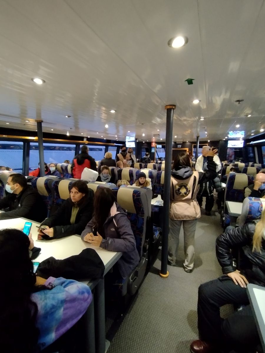 El barco es muy cómodo, de 2 pisos. Todos van sentados adentro y se puede salir a mirar y sacar fotos durante casi toda la navegación. Hay baños y una cafetería. También servicio de fotos si uno quiere comprar.