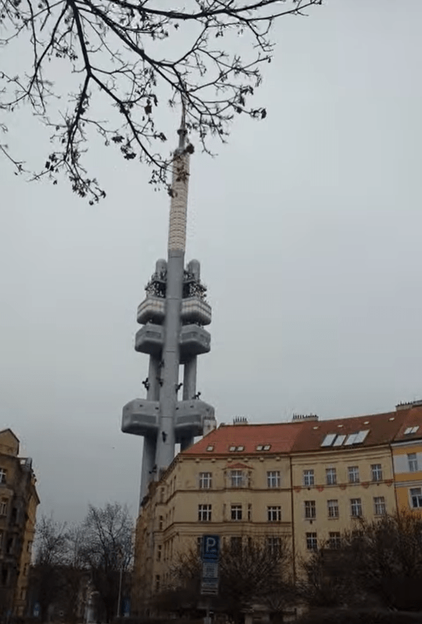 Para su construcción en los años 80 se levantó un antiguo cementerio judío y se usaron lápidas como adoquines. Años después fueron retiradas y se construyó un monumento en el sector del cementerio que quedó junto a la torre. Hoy se puede subir para tener una vista 360° de Praga. También funciona un restaurante y el único hotel de una sola habitación del país.